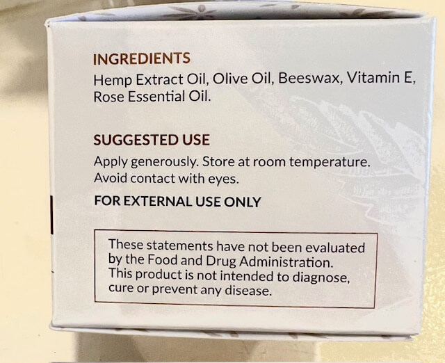 Ingredients: Full Spectrum Hemp Extract, Dragonβs Blood, Calendula Extract, Cayenne Extract, Nettles, Angelica Root, Vitamin E, Menthol Crystals, Essentials Oils, Organic Refined Coconut Oil, Beeβs Wax, Lavender, Eucalyptus